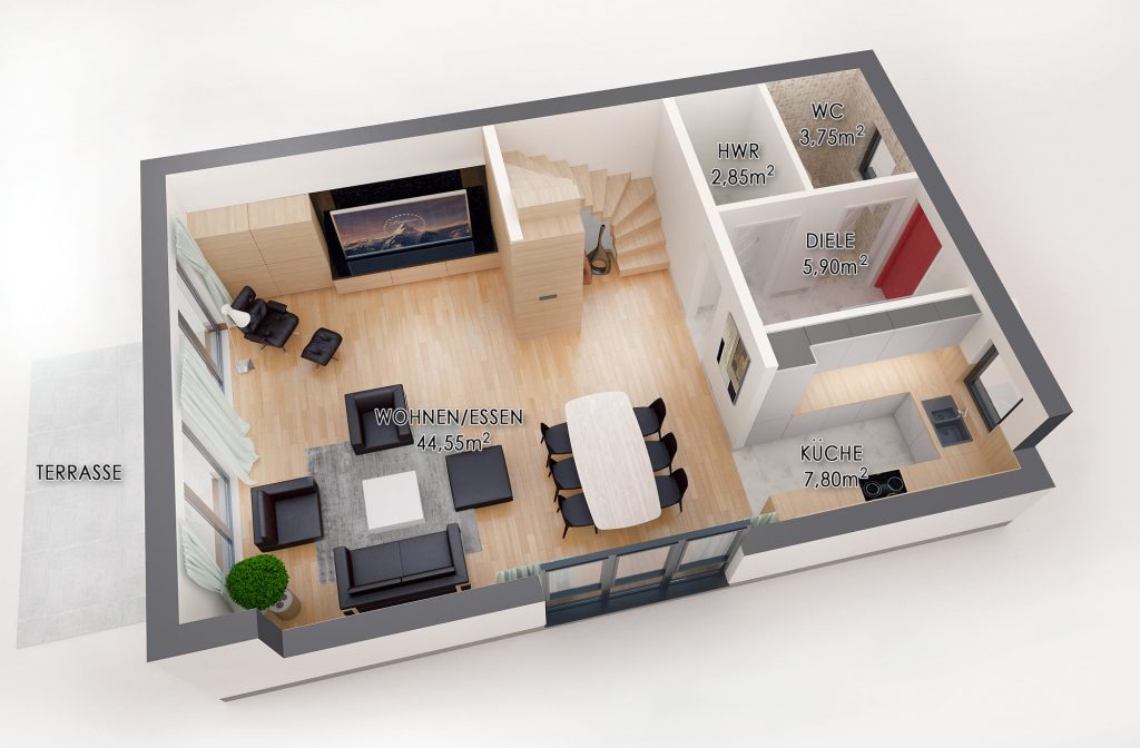 • Erdgeschoss: großzügiger Wohn- und Essbereich, Küche, Hauswirtschaftsraum, Gäste-WC